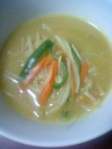 バターでニンジン、モヤシ、ピーマン、エノキ茸を炒め、小麦粉を加えてよく炒めカレー粉も加えます。