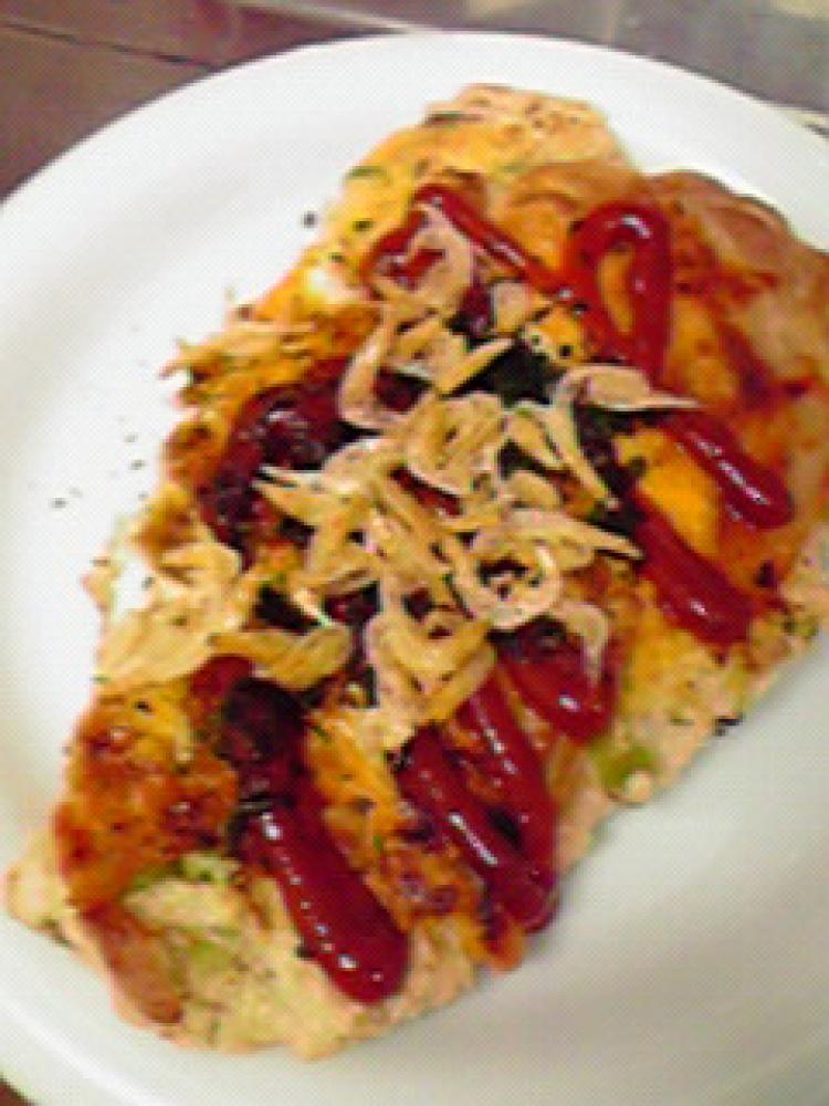 ケチャップをかけ、青のりと小えびをトッピングします。