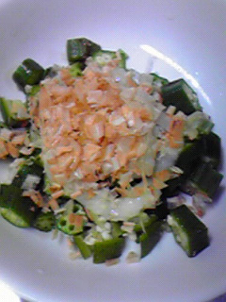 お皿にオクラを入れ、塩こうじをかけます。 おかかをトッピングします。 |