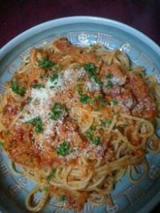皿に盛りつけ、お好みで粉チーズを振り、パセリを散らして、出来上がりです。