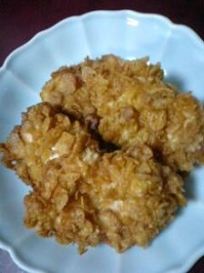 下味をつけたチキンにパン粉づけの要領で、衣とコーンフレークをつけます。