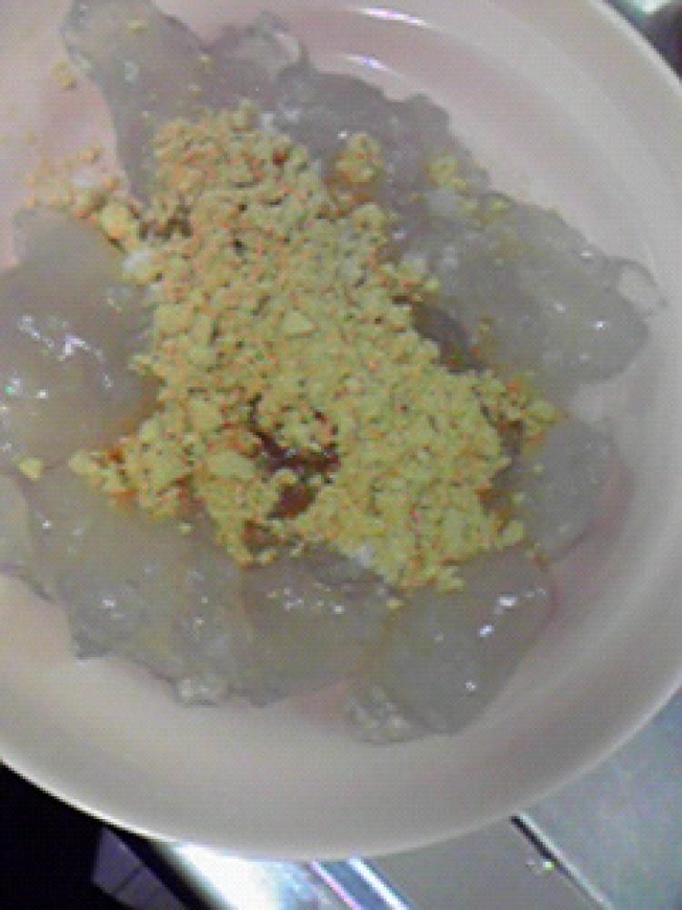 ![]() スプーンで一口サイズにすくい、氷水の中へ入れて冷やします。
