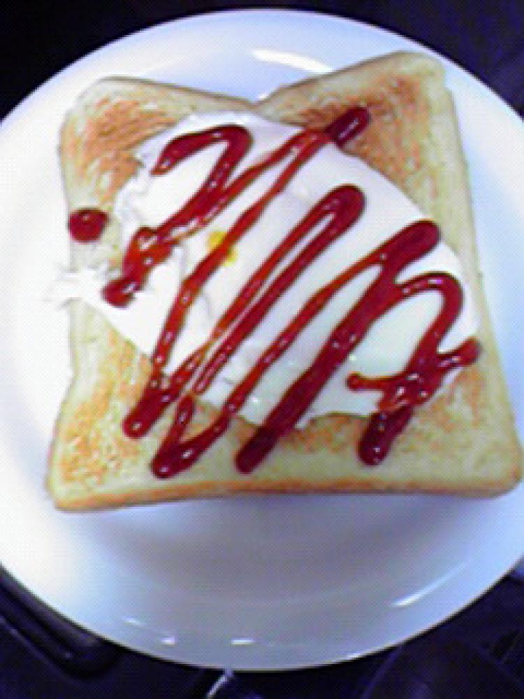 トーストに目玉焼きを乗せ、ケチャップをかけます。 |