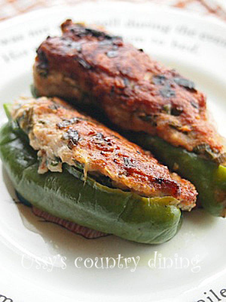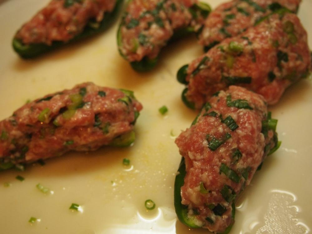 ![]() ピーマンに山盛りにひき肉だねを入れる。