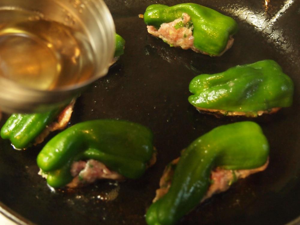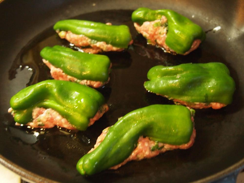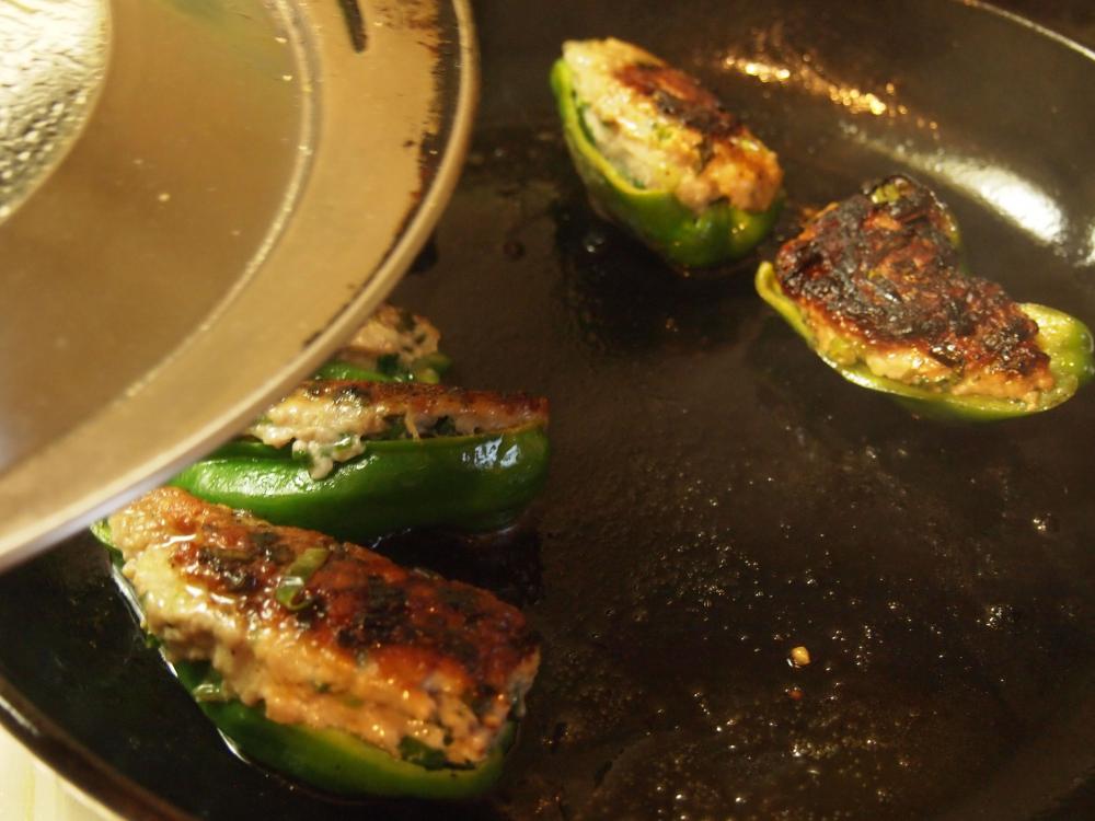 ![]() 肉に火が通り、水分がほとんど飛んだらピーマンの豚ひき肉詰めをひっくり返し蓋をする。ピーマンに焼き目をつけたら出来上がり。