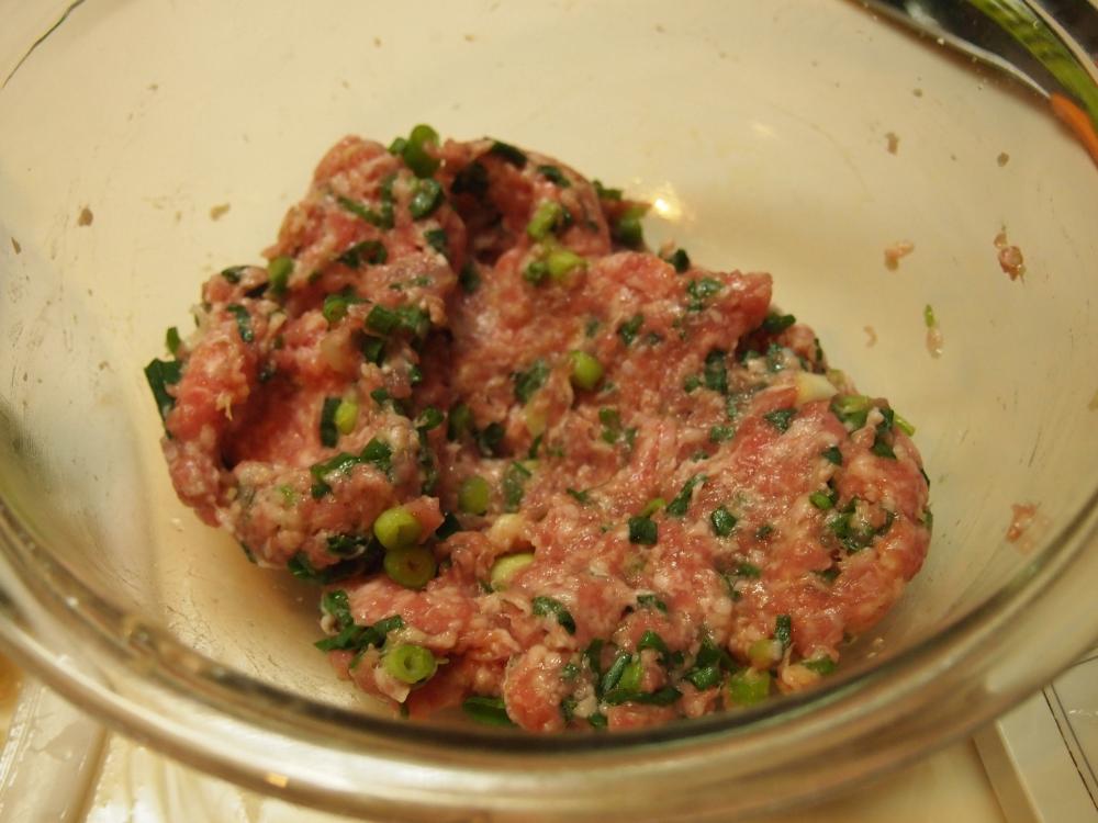 ![]() ボウルに豚ひき肉と、青ネギ、しょうが、片栗粉、砂糖、塩、しょうゆを入れて、よくこねる。