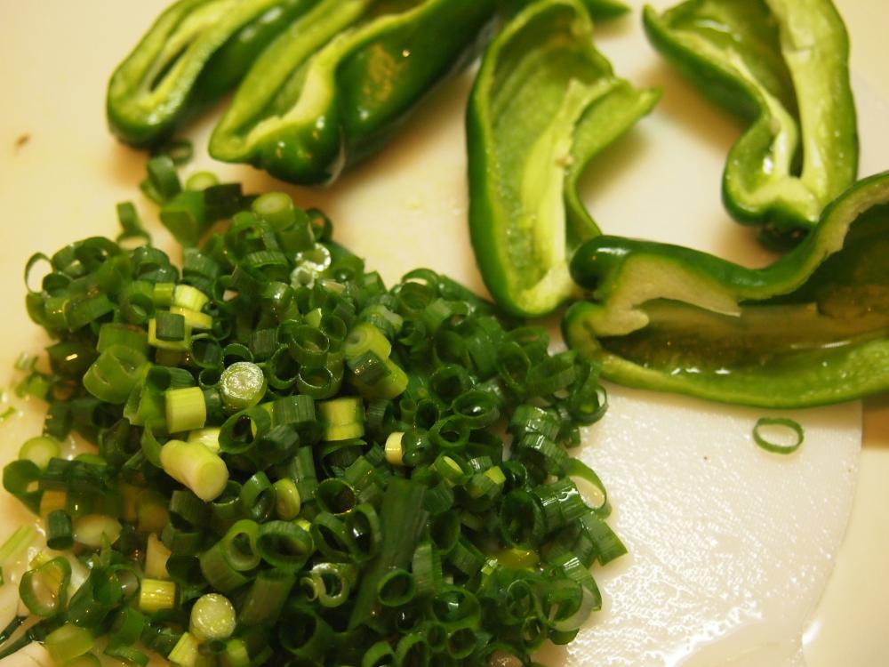 ![]() ピーマンを半分に切ってヘタを取る。青ネギをみじん切りにする。しょうがをおろす。