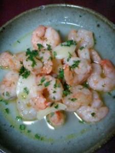 耐熱容器にエビ、ニンニクを入れてワインを振りかけ、オリーブ油を回しかけます。
