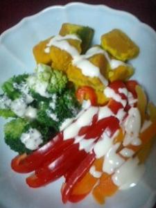 ブロッコリー、カボチャ、パプリカを皿に盛りソースをかけていただきます。