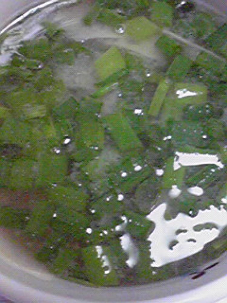 スープボウルにわかめ・スライスしょうが・ねぎ・みそを入れます。