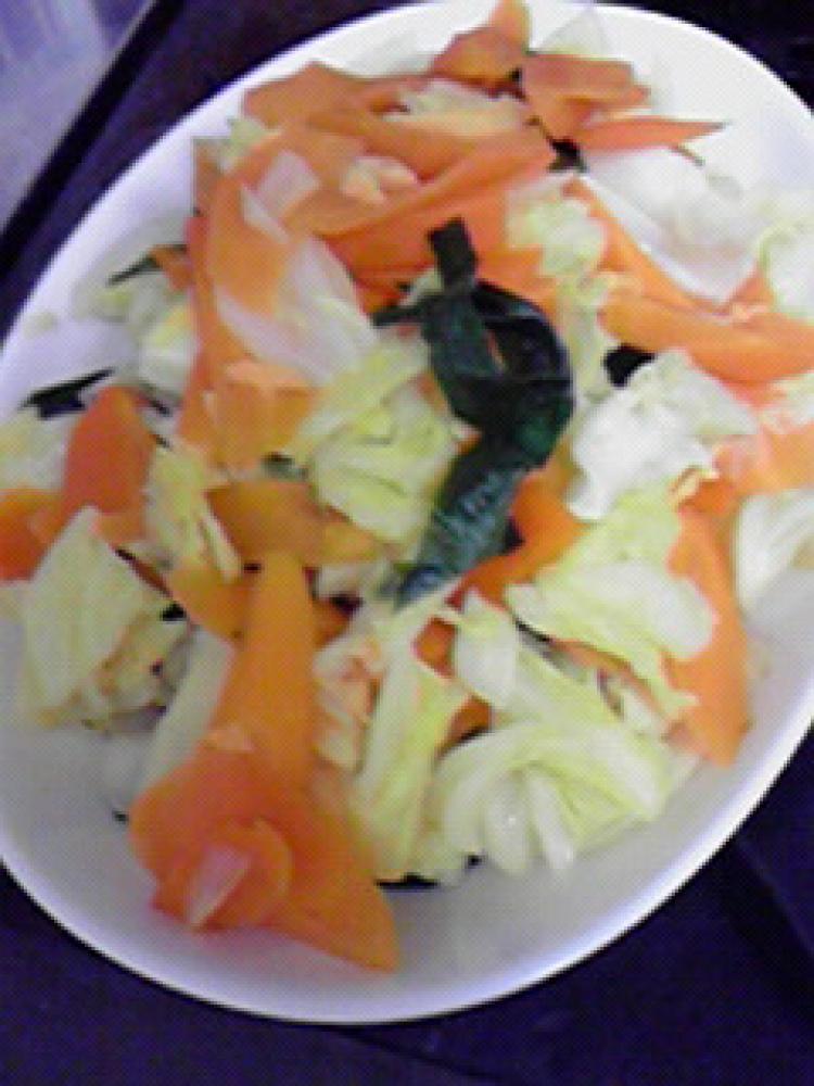 フライパンに、人参・春キャベツ・ニラの順に並べます。