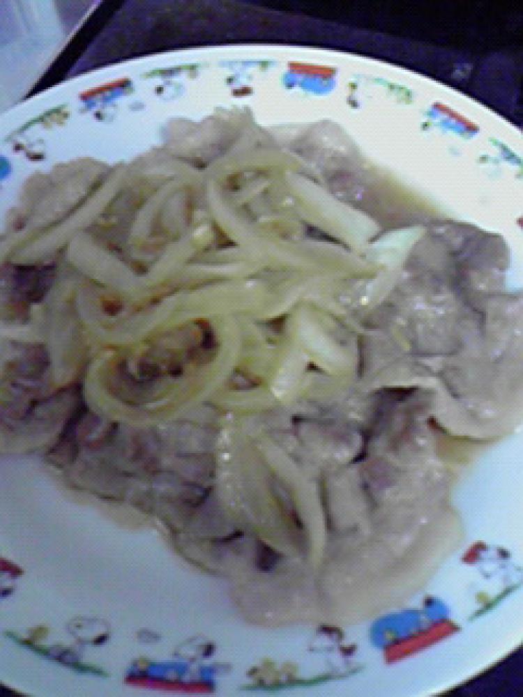 フライパンで、豚肉と玉ねぎ・しょうがを炒めます。豚肉に火が通ったら、酒を回しかけて、アルコールを飛ばします。