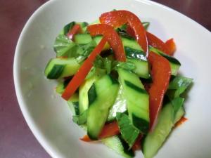 キュウリ、パプリカ、ちぎったバジルの葉をざっくり和えて器に盛り、3のドレッシングをかけます。