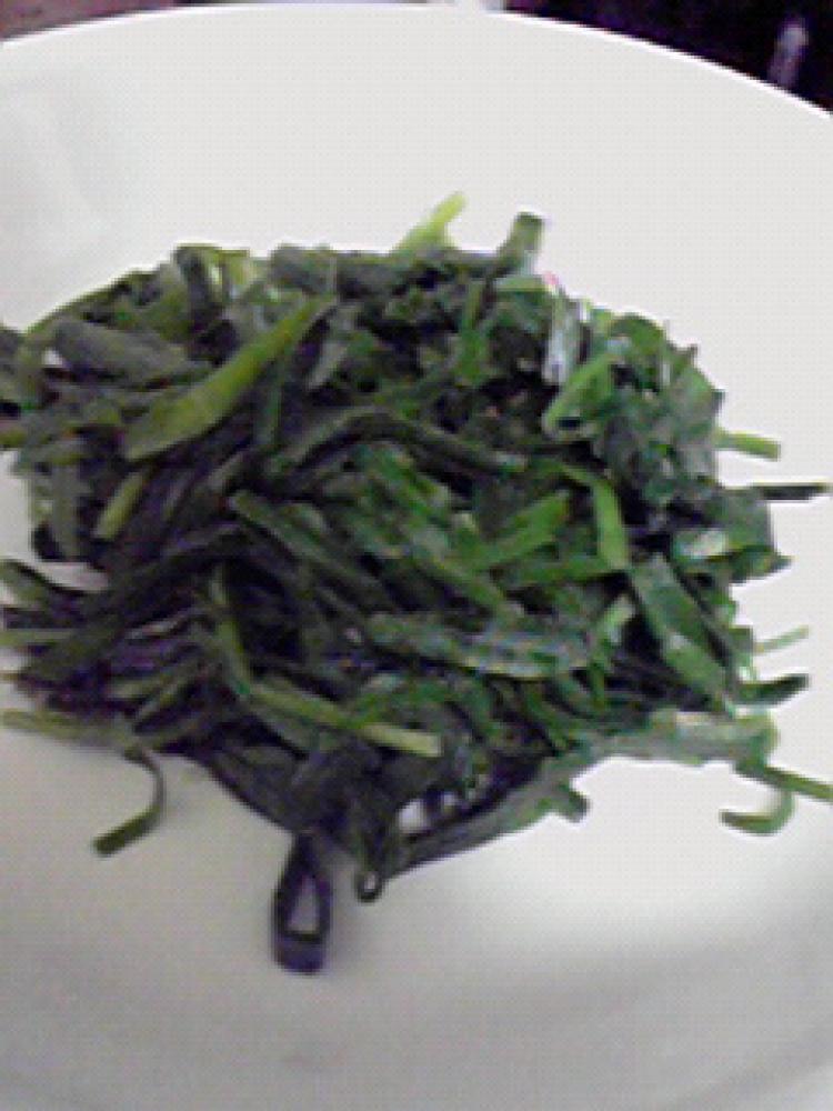 フライパンにオリーブオイルを熱し、ニラを炒めます。 |