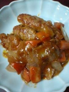 玉ネギ、ニンジンは乱切りにして、鍋にサラダ油大さじ1を熱して炒めます。