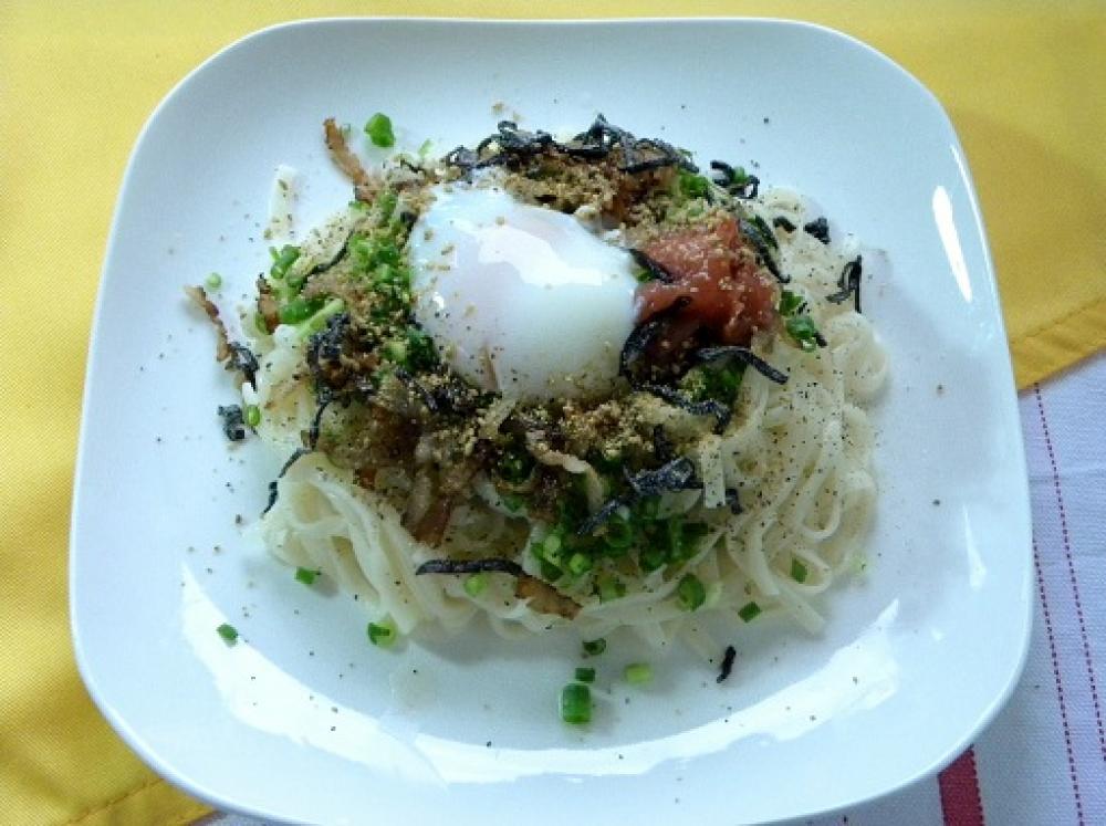 うどんを表示通りゆで、流水でもみ洗いし、氷水でしめてざるにあけ、水気を切ったら卵をのせるので中央をへこませて皿に盛る。