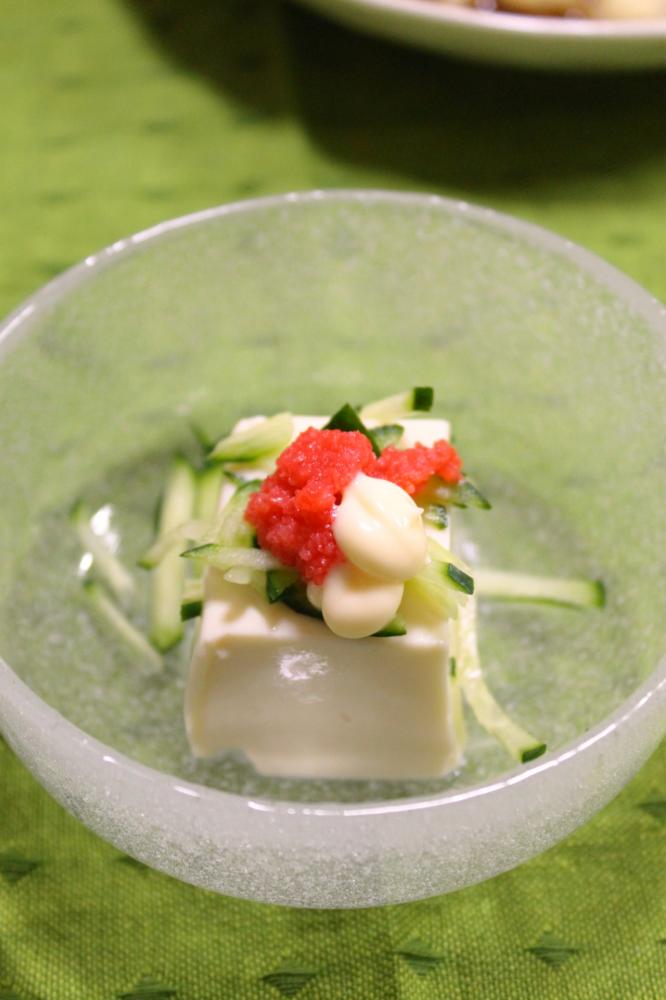 豆腐を器に盛り、1のキュウリと明太子、マヨネーズをのせます。
