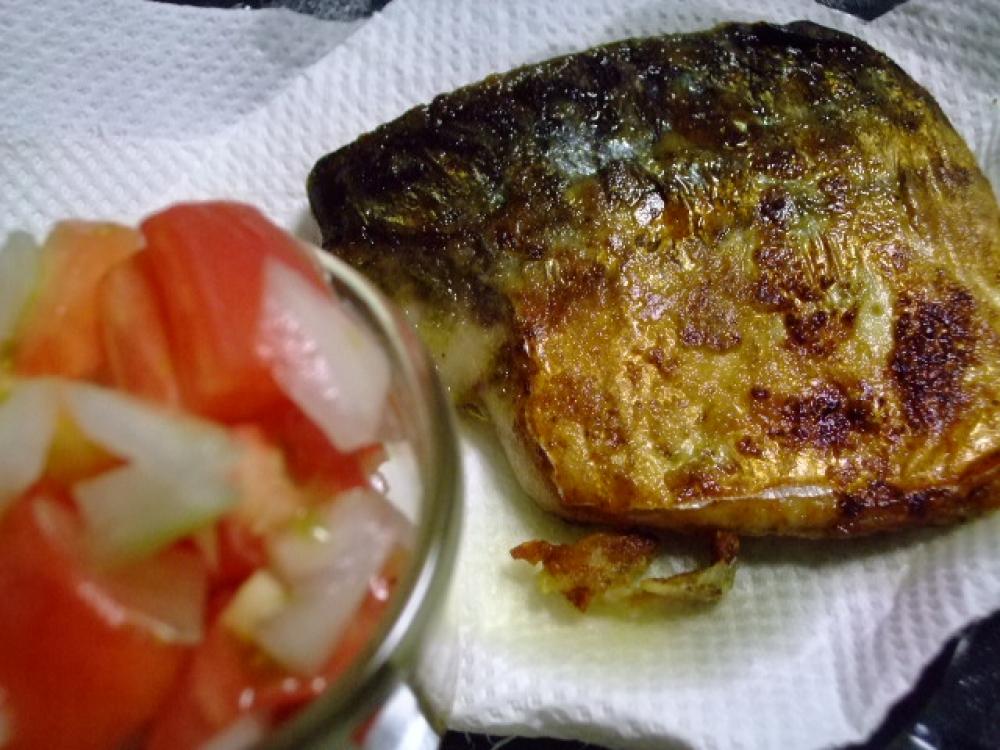 フライパンにオイルを引き、さばの皮を下にして入れ、焼き色が付いたら裏返して中迄火が通るまでしかりと焼きます