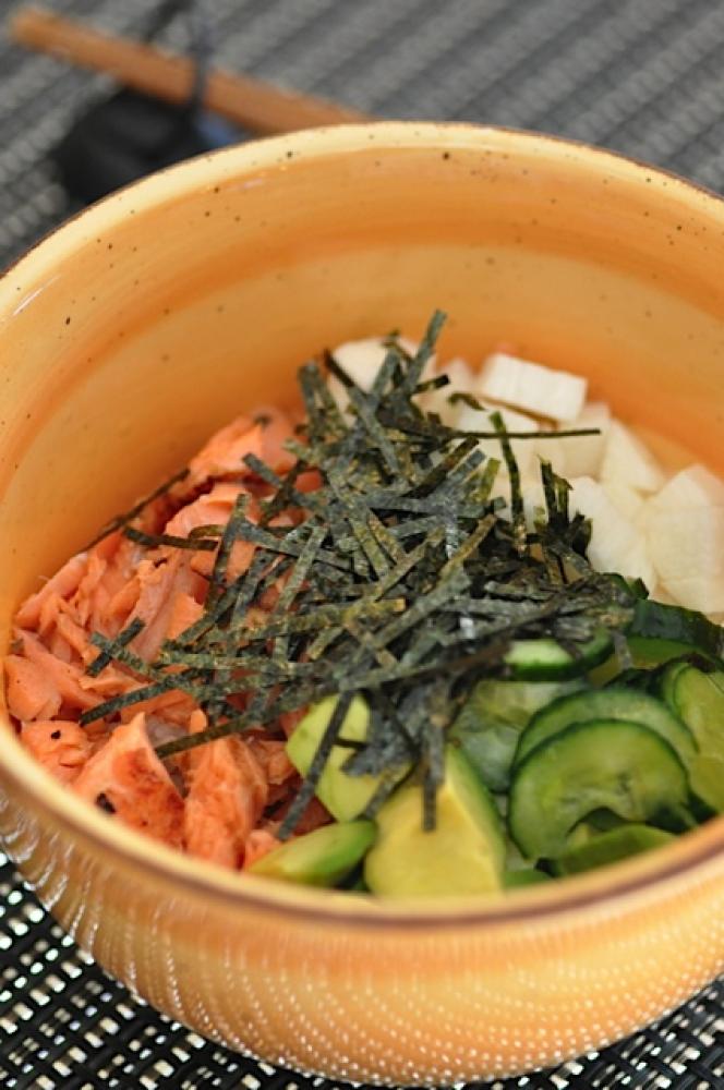 丼にご飯をもって、すった長いも、角切りにした長いも、ほぐした鮭、きゅうり、アボカドをのせる。