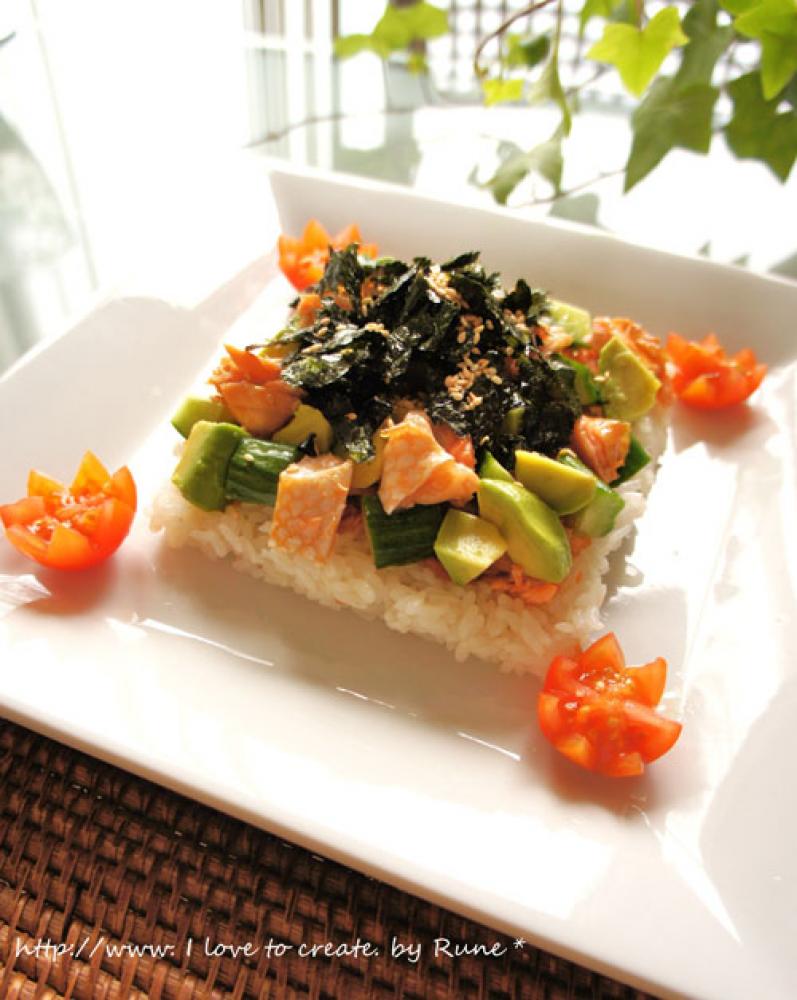 お皿にすし飯を薄く平らに広げ、照り煮にしたハラスのくずをのせ、きゅうりとアボガドをのせる。
