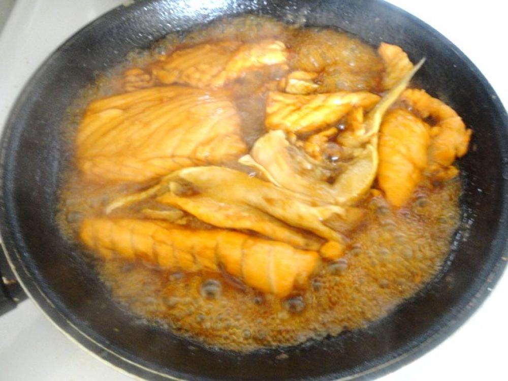 ![]() フライパンにAの調味料を入れてハラスを並べ中火の強めで汁をかけながら煮ます。