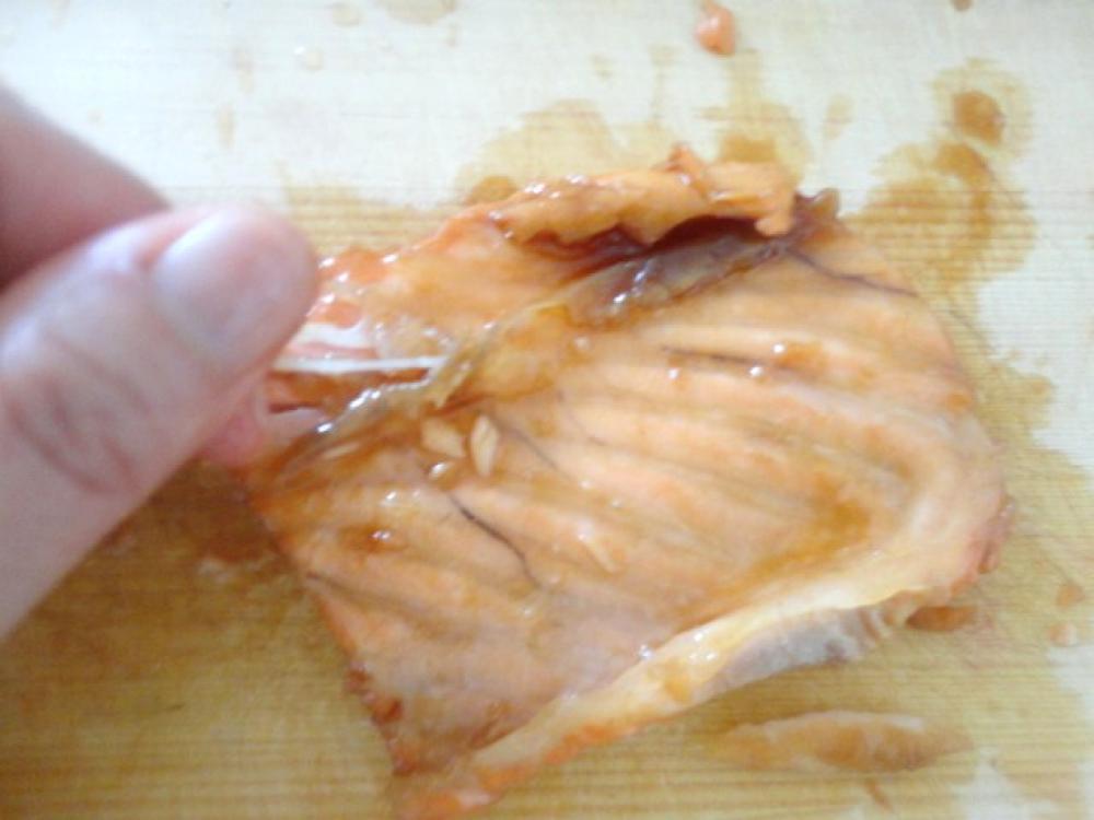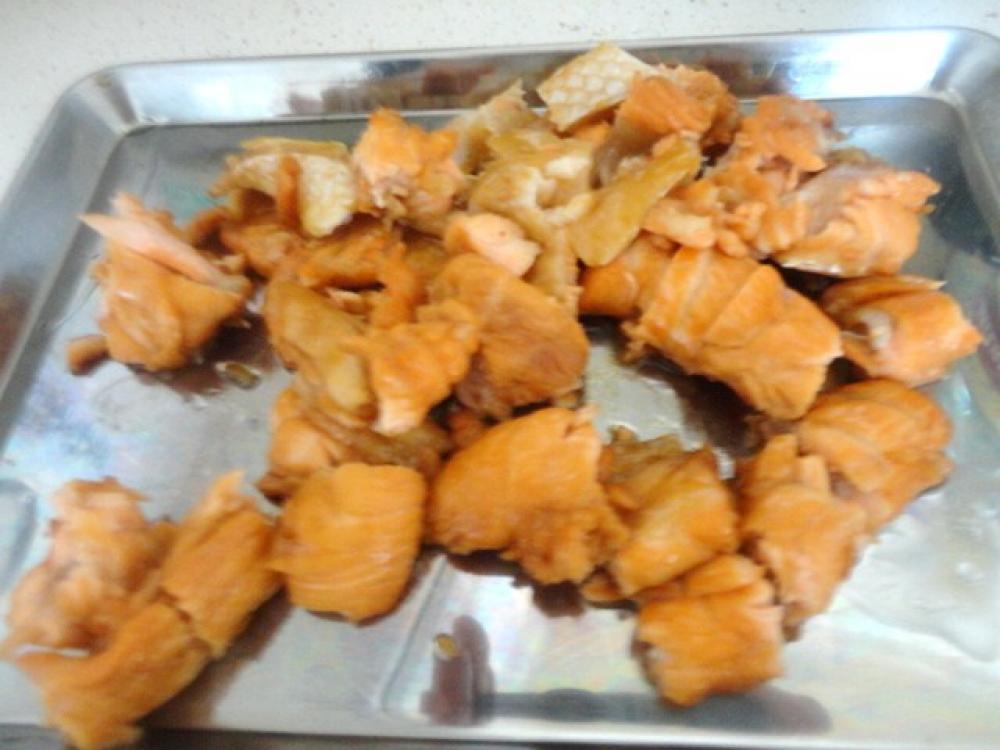 ![]() 煮詰まって汁にトロミがついて、ハラスに照りが出たら火から下ろす。少し冷めたら骨をはずす。1センチ角になるように切る。