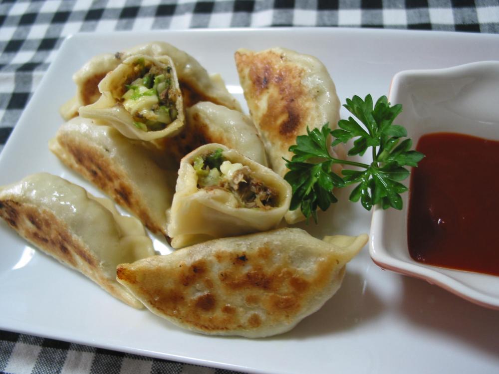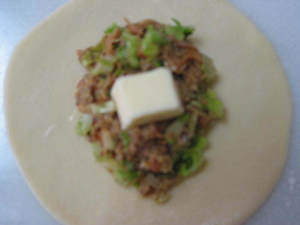 ![]() 餃子の皮に2の具と7mm角にカットしたチーズをのせる。周りに水をつけて包む。
