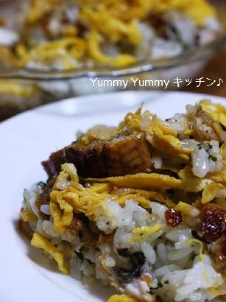 寿司飯を作り、千切りにしたしその葉とうなぎのかば焼を細切りにしたものを、半分程度寿司飯と混ぜ合わせる。