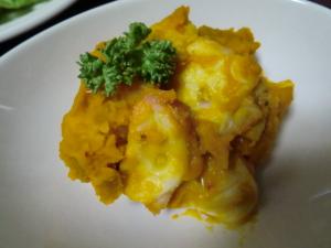 カボチャは、種とわたを除いて、1口大に切り、柔らかく茹でて、ざっとつぶして