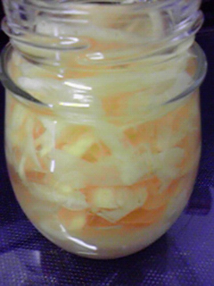 ピーラーで薄くスライスし、保存瓶に入れます。 |