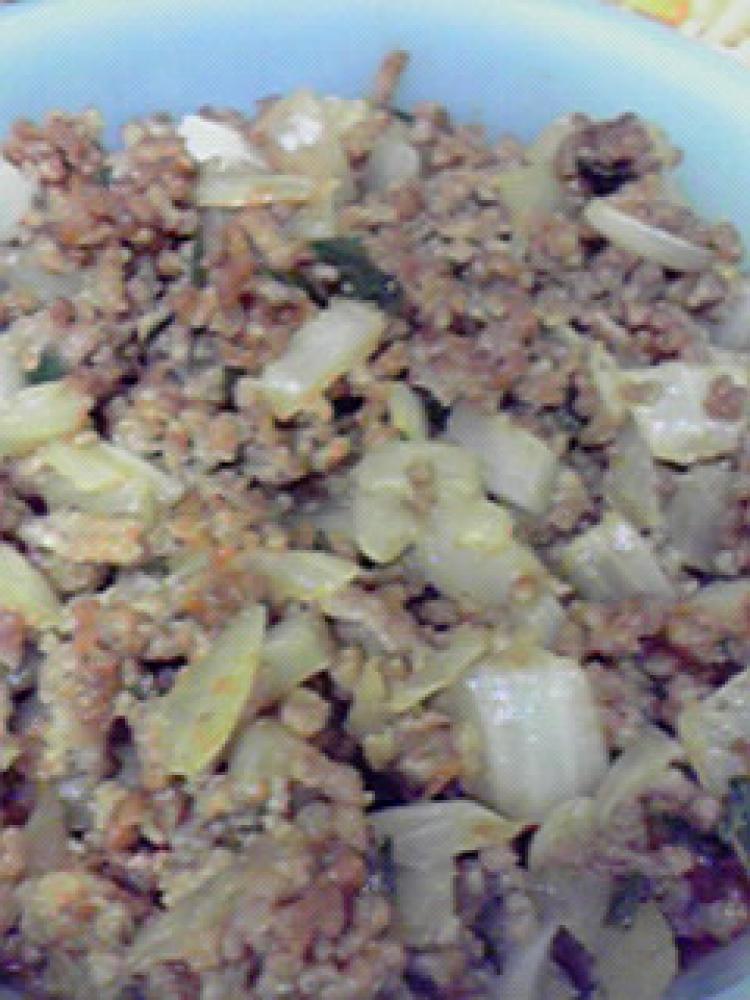 フライパンにひき肉と玉ねぎを入れて炒めます。 |