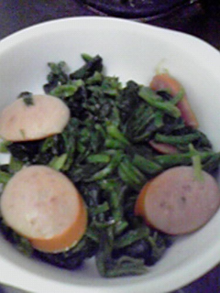 ウインナーは、斜め薄切りにします。 フライパンで、ウインナーを炒めます。 |