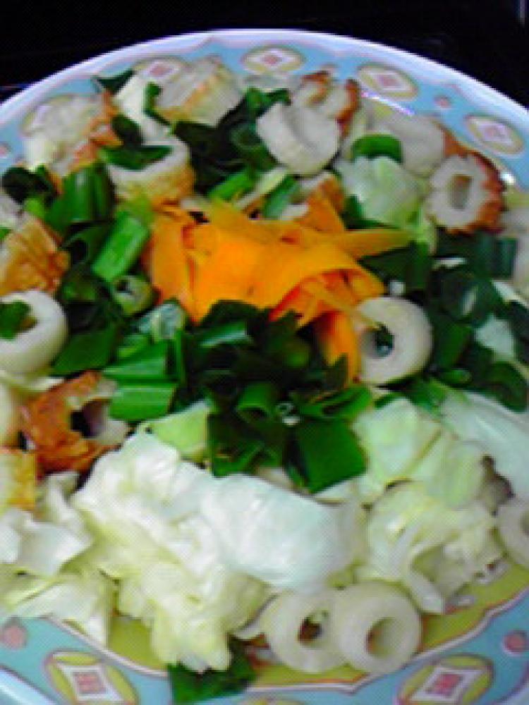 耐熱皿に、玉ねぎ→人参→キャベツ→ちくわ→ねぎの順に重ね、軽くラップをして、レンジで3分加熱します。