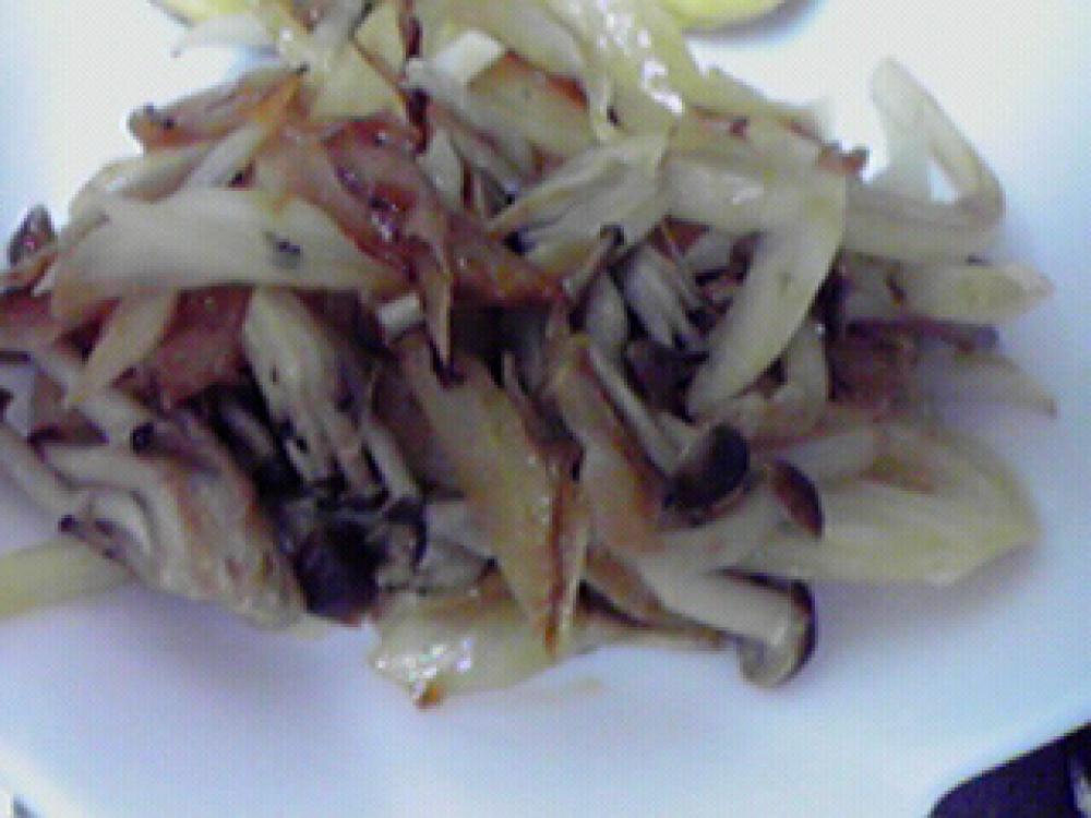 玉ねぎは食べやすい大きさに切ります。 フライパンで、玉ねぎとしめじを炒めます。 |