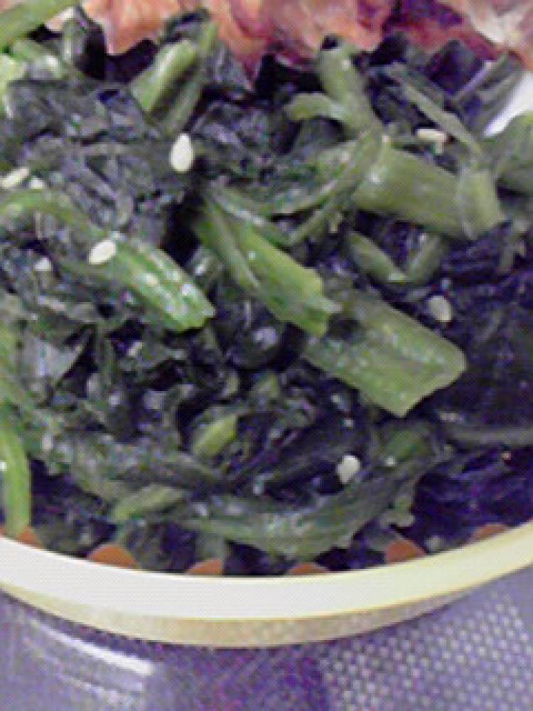 しんなりしたら、塩で味を調え、すりごま機でごまをすりながらかけます。