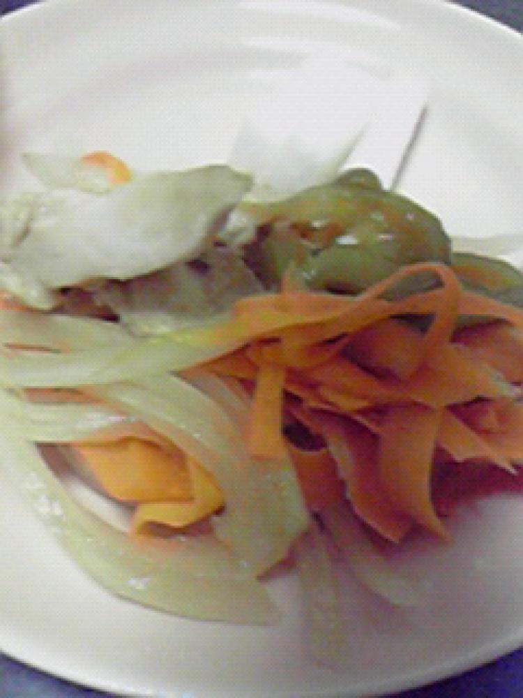 耐熱皿に野菜を入れ、上に鶏肉を並べます。