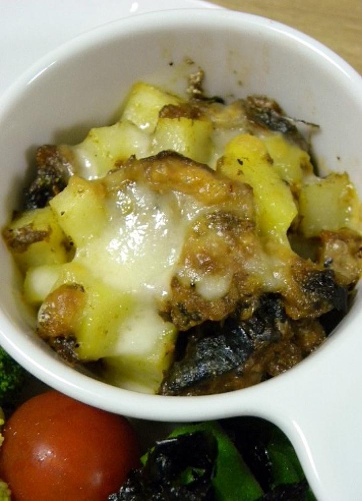 鯖缶の身の部分とカレー粉をジャガイモの入ったシリコンスチーマーに入れ、スプーンでざっくり混ぜたらグラタン容器に入れる。