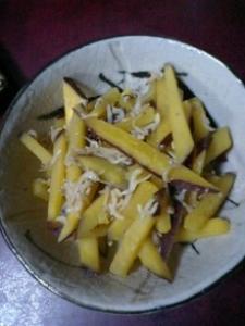サツマイモはよく洗って、4~5mm厚さの斜め切りにし、さらに4~5mmの細切りにします。