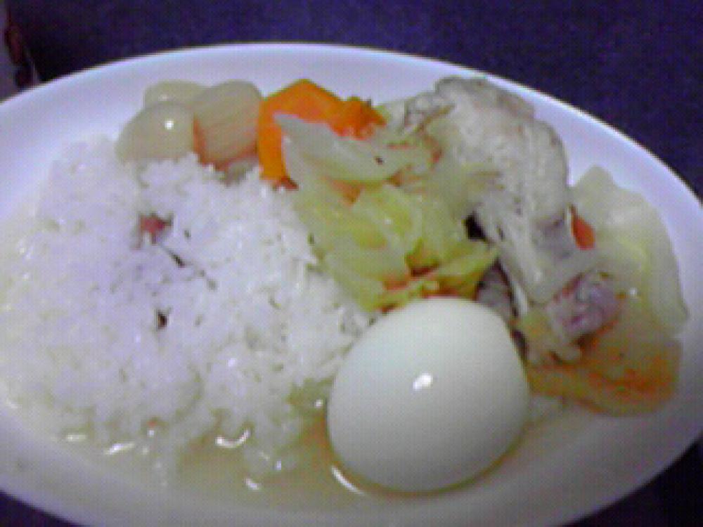 お皿にご飯を盛り、スープをかけ、ゆで卵を添えます。