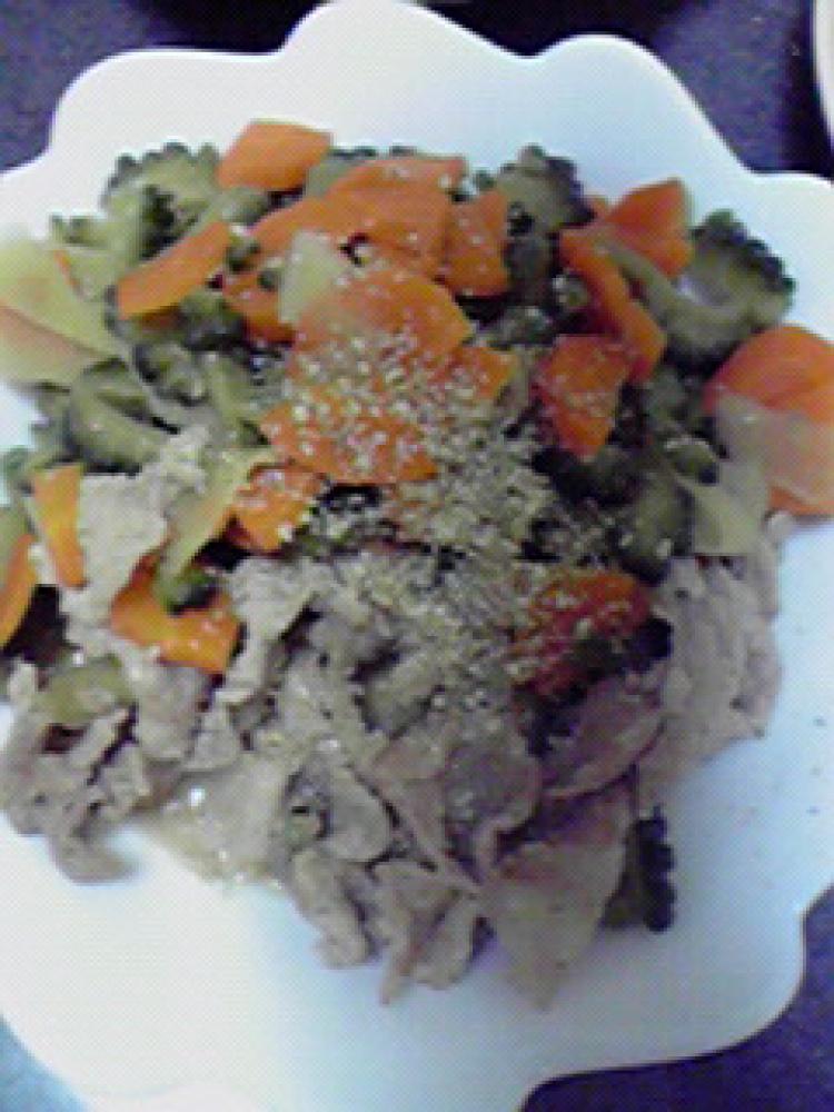 豚肉の色が変わったら、ゴーヤを加え、調味料で味を調えます。