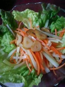 セロリ、ニンジンは7~8cm長さに切り、2mm幅の厚さにスライスします。サニーレタスは、適当な大きさにちぎります。