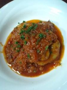 4の鶏肉を戻し入れ、トマトソースが煮詰まるまで10~15分ほど弱めの中火で煮込みます。