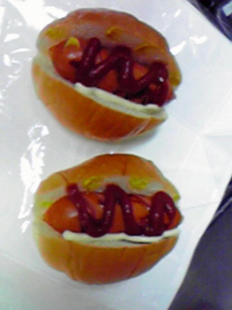パンにウインナーをはさみ、パンの片側にマヨネーズ、もう片側にマスタードをぬり、ケチャップをかけます。