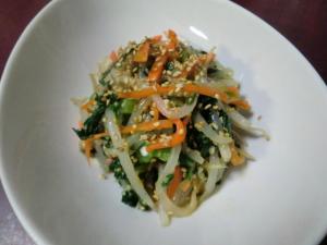 モヤシ、春菊、ニンジンと調味量をボウルに入れ、混ぜ合わせます。