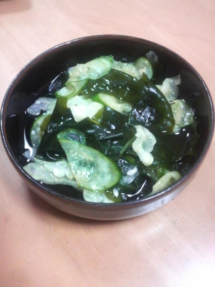 わかめ・きゅうり・ゴーヤをミツカンの「やさしいお酢」で和える。