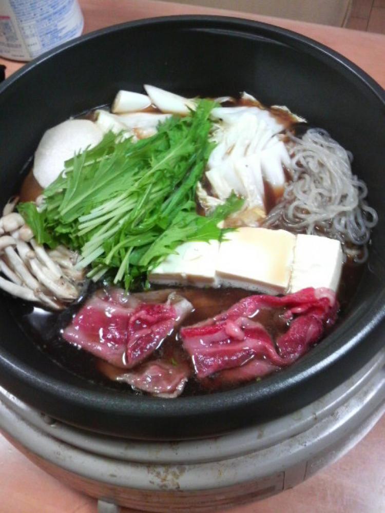 材料が煮え始めたら、牛肉を入れて軽く煮て卵に付けて食べる。
