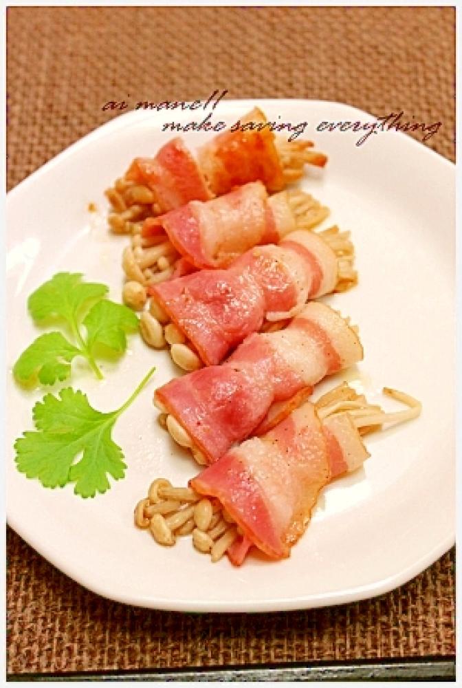 まな板の上にベーコンを並べエノキを10本位のせ、端っこからくるくる巻き、爪楊枝で止めます。