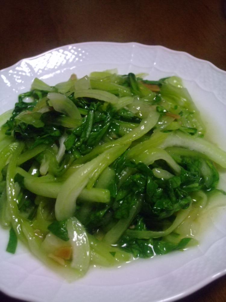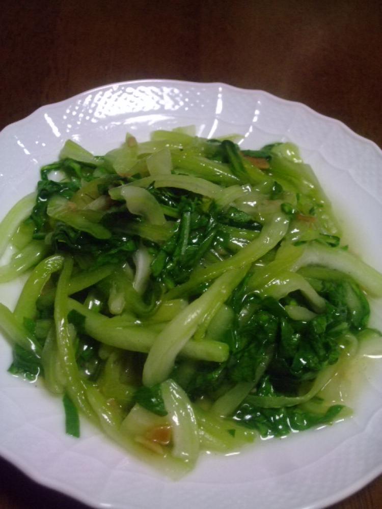 茎からニンニクと炒めます しんなりして来たらウェイパー、塩、コショウと葉を加 |