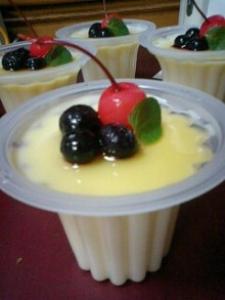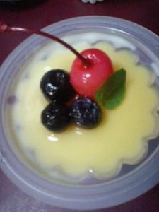 ![]() できあがったゼリーの上にガムシロップをかけブルベリーをのせ、ミントの葉を添えます。