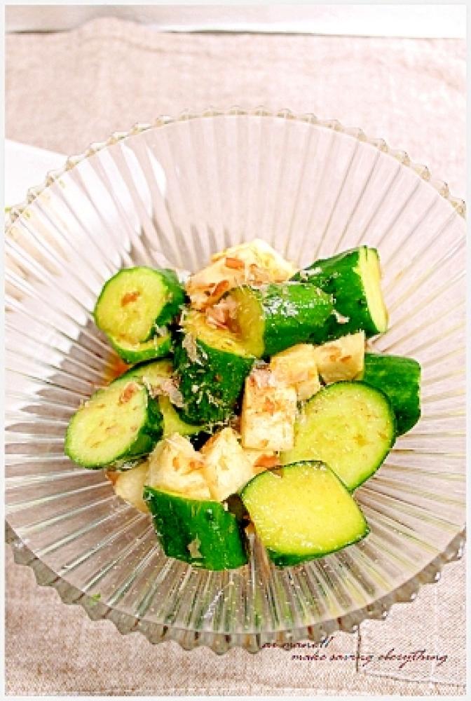 キュウリは水洗いし乱切りにします。全体に塩を少しかけます。